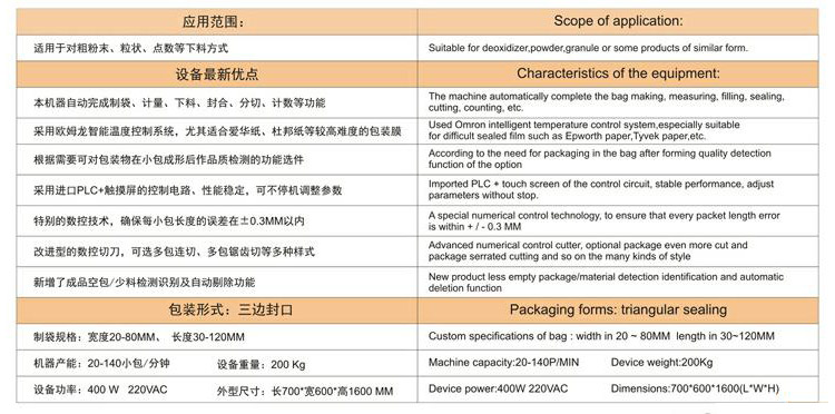 1.彩色觸摸屏和穩定可靠的雙軸高精度輸出的PLC控制,制袋、計量、充填、封合、打碼、切袋一次完成。